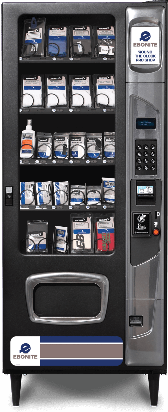 Ebonite Pro Shop Bowling Accessories Vending Machine Give your bowling customers peace of mind knowing supplies are available even if the pro shop is not open with the Ebonite bowling supplies and accessories vending machine. Vending small items like towels, cleaning sprays or wrist bands is easy with this highly visible vendor. Place in a location with more traffic and watch sales roll in even when there is no one working behind the counter.