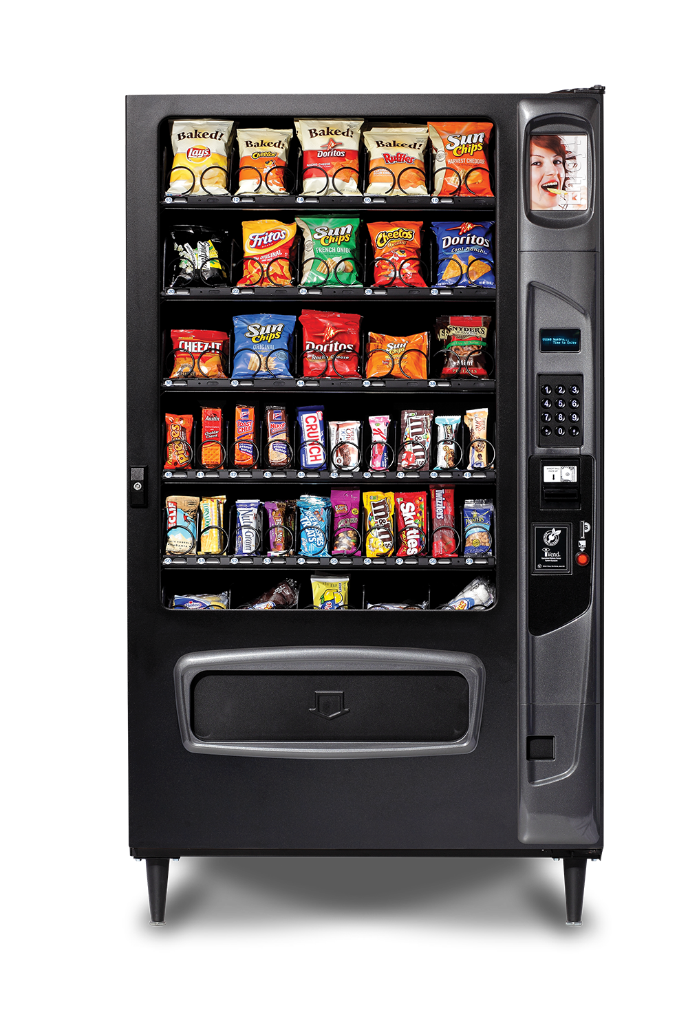 Snack Vending Machine: This 40-selection, Large Capacity Snack Vending Machine is the prime choice for high-volume locations. With 15 snack, 18 candy and snack cracker, 2 gum & mint and 5 pastry options to choose from, this vending machine has the selections and capacity that a large location demands.